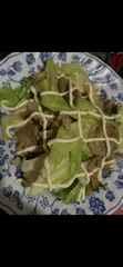 チキンをオリーブオイルで炒めよく火を通してからキャベツを入れさっと炒める。盛り付けてカラシマヨネーズをかける!