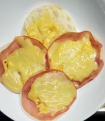 簡単ハムマヨ バタバタしているので、餃子の皮にハムをのせて、チーズ&マヨのせて、フライパンで焼きました😋簡単おいしいの大好き💕