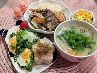 【肉豆腐】『新たまねぎ』『にんじん』『下仁田ねぎ』『白菜』『ホワイトしめじ』『九条ねぎ』『牛ロース肉』『すくい豆腐』『マヨネーズ』『昆布と鰹節の出汁』『酒』『みりん』『砂糖』『醤油』【かぼちゃサラダ】【茎ブロッコリーと小松菜とケールの和えもの】『茎ブロッコリー』『小松菜』『ケール』『ゆでたまご』『ご
