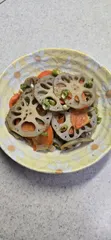れんこんをマヨネーズで炒めて(すき焼き調味料)で味つけしました。マヨネーズでコクが出て簡単のに本格的なきんぴらで美味しかったです👍🎶