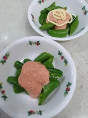 副菜 スナップエンドウの緑に呼ばれて購入。明太子とマヨネーズのソース。さらにおいマヨネーズ!おいしく頂きました。