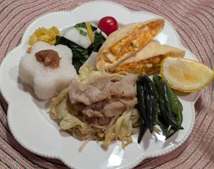 【油揚げのたらこマヨタマトースト 柚子添え 】【豚肉とキャベツともやしのマヨしょうが焼き】【万願寺とうがらしと紫ししとうのソテー】【もものすけの葉と柚子大根のお漬物の酢の物】【ご飯 南高梅の梅干しとオレンジ白菜のお漬物】【ミニトマト】