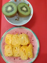 定番の玉子焼きと 私の定番のマヨネーズ入り玉子焼き、キウイ🥝を明日の朝ご飯用でいただきます(*^^*)ふわふわ食感の玉子焼きをいただくのが、すごく楽しみです😊