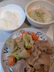 晩ごはん😊 マヨ味噌󠄀炒め、🐷生姜焼き、スープ