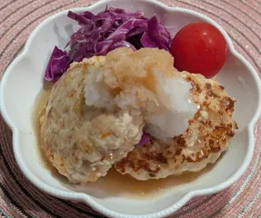 【豆腐ハンバーグ】『鶏むね肉』『お豆腐』『たまねぎ』『にんじん』『れんこん』『白ねぎ』『しょうが』『すりごま』『マヨネーズ』『ポン酢』『はちみつ』『大根おろし』 【赤キャベツのピクルス】【中玉トマト(フルティカ)】 【大根葉と柿としらすのサラダ】『黒酢たまねぎドレッシング』