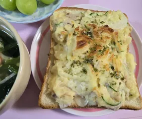 ポテサラチーズトースト 朝ごはんにポテサラにチーズをかけてトーストしました🍞🥔🧀美味しかったです😋