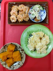 海老マヨ メインに 海老マヨ、カボチャ煮物、ちくわきゅうり巻き、カマンベールチーズ入りポテトサラダを作りました🧀今からいただきます(*^^*)