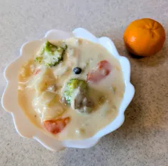 晩ご飯の残り😅クリームシチューです朝ご飯にいただきました🙏 人参🥕、玉ねぎ🧅、じゃがいも🥔、豚肉🐷ぶなしめじ🍄🟫をマヨとオリーブオイル🫒で炒め、ルゥと牛乳、水で煮込みました🤤 あとで別ゆでしたブロッコリー🥦を加えて軽く煮込みました🤤