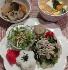 サラダクラブさんの【お家で作るごちそうサラダ 和風サラダ用】『胡桃とアーモンドドレッシング』 【5◯1の蓬莱さんの焼売】いただきものです🥰 【生姜焼き】『新たまねぎ』『春キャベツ』『生姜』『アレッタ』『しめじ』『豚ロース肉』『しらす』『アイオリマヨネーズ』『黒酢』『はちみつ』&n