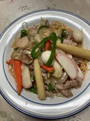 皿うどん 昨日の夕飯に作りました。具材は、うずらの卵・ヤングコーン・蒲鉾・にんじん・ピーマン・たまねぎ・海老・いか・豚こまです。具材を炒める時にマヨを使いました。