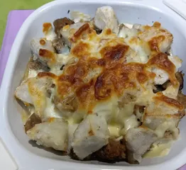 1番下にマヨをひいて、真ん中にチーズのおにぎり、周りに崩した炭火焼きハンバーグと里芋の揚げ焼きを置きその上にコムタンスープをかけて、チーズを乗せて焼きました。〆ご飯です。そしてこれは初めての投稿です❣
