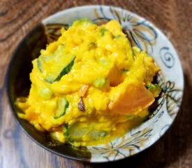 かぼちゃのサラダを作ろうとしましたが、煮すぎて崩れてしまいました。残念です(;´Д`) 味付けして煮たので、揚げないコロッケになるかも・・・