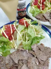 今日のマヨはかけただけ😅料理上手じゃないから…豚肩ロースはキユーピー3分クッキングパスタを手作りオイルソースで焼いただけ意外とおいしく出来るのです😋