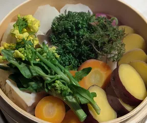 蒸し野菜♪ 家庭菜園で収穫できた野菜を蒸しました🧑🍳 『キャベツ』『大根』『赤かぶ』『じゃがいも(インカのめざめ)』『しめじ』『ごぼう』『さつまいも』『にんじん』『にんじんの葉』『茎ブロッコリー』『白菜のお花』 『柚子味噌マヨネーズ』『金山寺味噌マヨネーズ』 蒸したことで甘くなっ