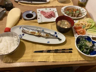 晩ご飯です 定番の秋刀魚です。マカロニサラダも作りました♪まぐろの刺身、根菜の煮物、ほうれん草と大根おろし、しらす干しのゆずぼん和え、味噌汁、サラダにマヨネーズです。新マヨ開封しました😊