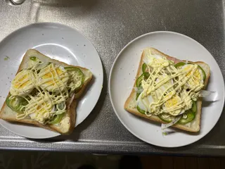 ハムチーズゆで卵のマヨネーズトーストです😊食パンにマーガリンとマヨネーズを塗って、具材の上にマヨネーズで線引きしました♪ピーマンと玉ねぎ、黒胡椒も入れました。