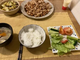 鶏肉とカシューナッツの炒め、マッシュルームとたこ、じゃがいものアヒージョ、作り置きの豚汁、サラダにマヨネーズです。