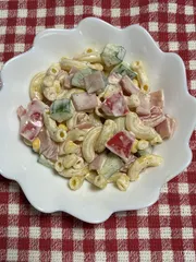 野菜の日にマカロニサラダ🥗 昨日は野菜の日🥦🫛🥬🍅 忙しくてメインは残り物😅でもサラダ🥗だけは作りました😁キュウリ🥒、コーン🌽、トマト🍅、ハムを入れたマカロニサラダです😊