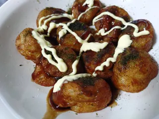 揚げたこ焼きにソースとマヨネーズ熱々で美味しかったです😄