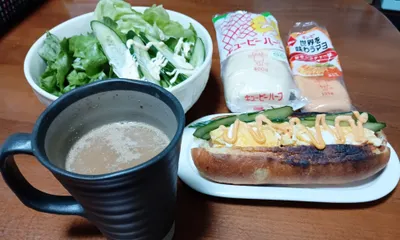 今日は野菜が食べたくてたっぷりのレタスにきゅうり、ホットドッグ(マヨネーズ入卵焼き、ウインナー、きゅうり)にカフェラテ。キユーピーマヨネーズと旨辛シラチャー味で頂きます。