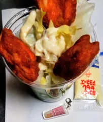 コンビニのカウンターフーズについているのはキユーピーマヨネーズ💛 ちょっぴりからいチキンなので、からしマヨネーズはやめてタルタルソース(もキユーピー)にしました、おいしいです😋 レタスとともに🥬 明日は健康診断で半日絶食つらい🙃