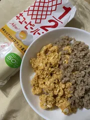 2色丼 炒り卵を作る時、すりおろし人参をマヨネーズで炒め、溶き卵を入れ、作りました。マヨネーズで旨みアップです。