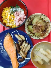椎茸のマヨネーズ炒め、焼鮭、サラダ、焼きナス、白菜と油揚げと えのきのおみそ汁を作りました😌温かい料理にパワーをもらえました😋