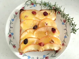 リンゴは薄切りにしてレモンとお砂糖を枯れてレンチンし クリームチーズとマヨネーズを合わせてパンに塗りリンゴを並べて トースターで焦げ目がつくまで焼きくるみとドライフルーツをトッピングしシナモンをかけて美味しく頂きました 甘しょっぱい味わいで美味しかったです