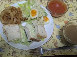 マヨだらけ オニオンリングの衣にマヨ、つけるソースもハニーケチャマヨ。アボカドとポテトのサラダにマヨ。韓国海苔とチーズのサンドイッチのパンにもマヨ塗り塗り。