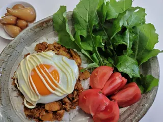 ご飯の上に、にんにくすりおろし•玉ねぎ•ごぼう(中濃ソース•カレー粉•ケチャップ•味噌)炒め蒸し焼き、目玉焼きのせマヨネーズ線描き。トマトと育ったルッコラ添えました。🌻