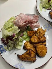 鶏胸肉でタンドリー風チキンを作りました。マヨネーズ、カレー粉、トマトケチャップ、はちみつ、にんにく、生姜にそぎ切りの胸肉を10分付け込みました。