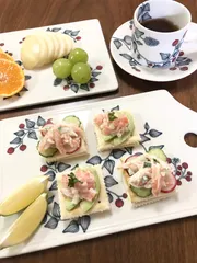 カナッペ 本日のブランチにマヨネーズ × マオンソースを使い青森サーモンタルタルと カニカマの二種類のカナッペを作りました。(カニカマの方は キユーピーさんのマオンソースサイトのレシピを参考にアレンジしました。) マヨネーズ × マオンソースのみでお味がキマってしまったためほかの
