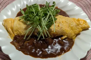 オムライス♪ 前日のハッシュドビーフの残りで、オムライスを作りました🧑🍳たまごはマヨネーズを入れて作りました🌟 ライスはトマトライスの炊き込みご飯🍅『たまねぎ』『にんじん』『しいたけ』『ピーマン』『トマト』『ベーコン』『マヨネーズ』『トマトケチャップ』『白ワイン』 26cmの大きなフライパン