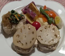 【鶏ささみのれんこんのはさみ焼き】【ジャンボピーマンとパプリカと白ねぎ炒め】【大学芋】【玄米ご飯 ちりめん山椒と大根葉のお漬物】【お味噌汁】『たまねぎ』『にんじん』『大根』『れんこん』『白ねぎ』『春菊』 鶏ささみを包丁でミンチ状にして、たまねぎと白ねぎと生姜を混ぜて、世界マヨ コク深アイオ