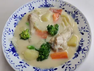 ホワイトシチュー 鶏手羽元にまぶし具材炒める時にマヨネーズ使いました。