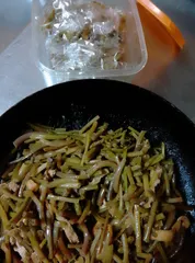さつまいもの茎のきんぴらです。生前祖母が戦時中食べたと話ていたものを作ってみたら美味しく毎年作ります。お料理してから冷凍保存すると美味しく保存できると菜園仲間に教えて頂き、大量に作ってみました。炒めるときにマヨネーズ使いました✌ 食べる日が楽しみです😊