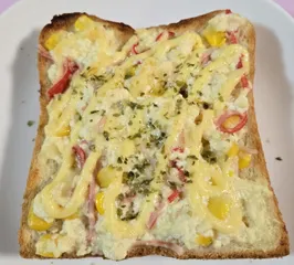 カニクリーム風トースト🦀🍞🍴 カニクリーム風トーストのレシピを見つけて🔎豆腐、カニカマ、コーン、バター、牛乳、マヨネーズ、チーズを混ぜたのを🍞乗せてトーストしました😊クリーミーではありましたが、カニクリーム感はあまり感じませんでした😅何かが足りませんでした(笑)
