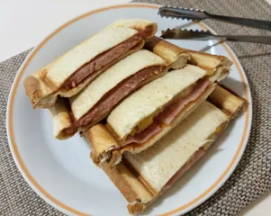 ホットサンド 朝ご飯のホットサンドです♪食パンに塗ったり、具材の卵焼きを作るのにマヨネーズを使いました