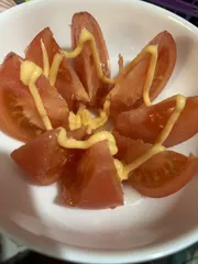トマトに甘辛スウィートマヨネーズ トマトに甘辛スウィートマヨネーズをかけて、、、、私はグラニュー糖を少しプラスしています。食後にフルーツ感覚で、、、、