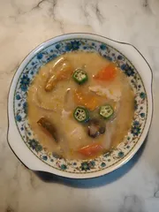 ハロウィンの余韻で?!…マヨに漬けておいた鶏むね肉、かぼちゃ🎃、たまねぎ🧅、人参🥕、マッシュルーム🍄でシチューを作りました♪オクラは生のまま(シャキシャキ食感が楽しいので)あとからトッピングしてみました♪
