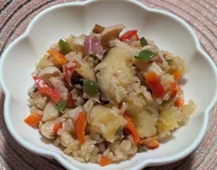 さつまいもご飯♪ さつまいもご飯🍠『玄米』『さつまいも』『赤たまねぎ』『にんじん』『ホワイトしめじ』『しいたけ』『ベーコン』『しらす』『ジャンボピーマン』『こどもピーマン』『赤パプリカ』 世界マヨ アイオリ味を入れて炊きました。ガーリック風味が加わり美味しかったです💗