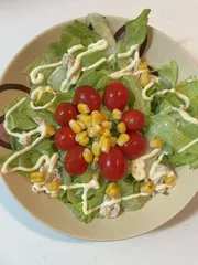 サラダ 先日、娘が作ったサラダです。(レタス、ミニトマト、コーン、ツナ、マヨネーズ)