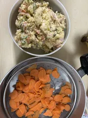 ポテサラ 王道の(だと思う)ポテサラ、マヨネーズ➕甘酢でお店の味に近づける。ジャガイモとニンジンはいつもこの鍋で蒸します。ニンジンは多めに蒸して冷凍に。