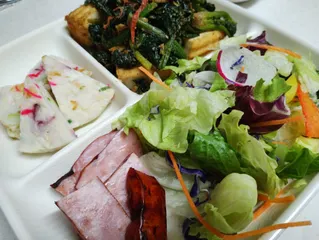 ほうれん草と厚揚げをマヨソテーし すりゴマと出汁醤油で味付けしました。(カニカマ入り ) サラダクラブさんの10品目のサラダレタスやパプリカ(和風醤油ごま入ドレッシング掛け ) タコそふと、焼豚