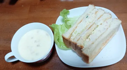 ふーふーちゃんさん ポテトサラダのサンドイッチ 大好きです♡ とても美味しそうですねー スープは クラムチャウダーでしょうか 寒くなって参りましたので ミルクベースのスープは 五臓六腑に染み渡り ほっこりいたしますねー♪
