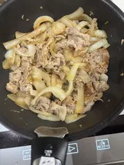薄切りブタロースをおろしタマネギと生姜、醤油、酒、みりんに漬け込み、マヨでタマネギと一緒に焼きました。甘辛く仕上がりました。