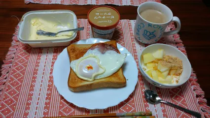 休日のモーニング☕🍞🌄 日曜日の朝食。☔/☁️ 🥚サニーサイドアップ &ハムにマヨかけ🍎ヨーグルト(ハチミツ、きな粉)☕カフェオレ 雨が降ってなかったら、午後からハロウィンラン🏃 Ψ( ̄∇ ̄)Ψ オレンジイロノ ヤマタカボウ カブルダケ 🎃