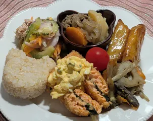 【ゴーヤサラダ】「サラダクラブさんのツナコーン」「にんじん」「今年最後のゴーヤ」「赤たまねぎ」【昨日の肉じゃが】【大学芋】【サーモンフライ】「サーモン」「青じそ」「スライスチーズ」【ミニトマト】【鶏レバーのきんぴら】【鶏レバー】「ごぼう」「にんじん」「れんこん」「赤唐辛子」【玄米ご飯】 メ