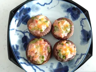 しいたけのマヨチーズ焼き マヨネーズ、塩コショウ、ハムとピーマンのみじん切りをあわせたものをしいたけに乗せて とろけるチーズを乗せトースターで焼き目がつくまで焼いて完成です しいたけからうまみがたっぷりマヨチーズのコクがプラスされて美味しい一品になりました