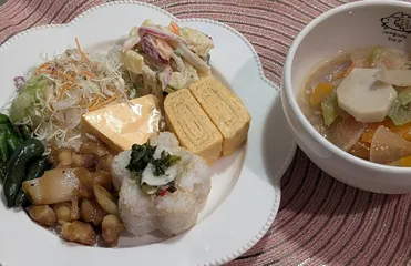 サラダクラブさんの【ミックスサラダ】【さつまいものサラダ】『さつまいも』『にんじん』『赤たまねぎ』『れんこん』『こどもピーマン』『姫りんご』『りんご酢』『マヨネーズ』『マスタード』【万願寺とうがらし炒め】【鶏なんこつ焼き】『鶏なんこつ』『白ねぎ』『生姜』【チェダーチーズ】【だし巻きたまご】【玄米と白